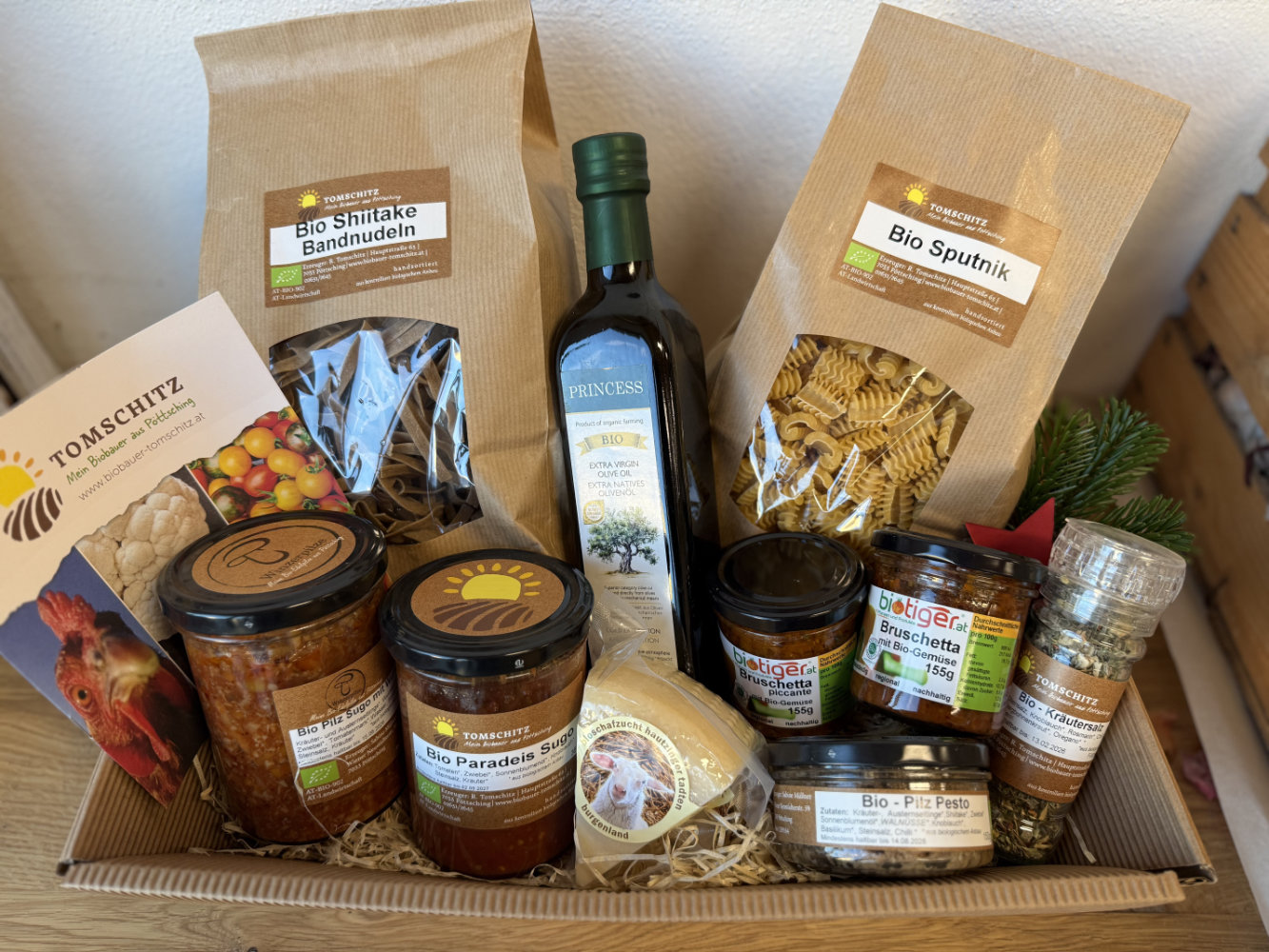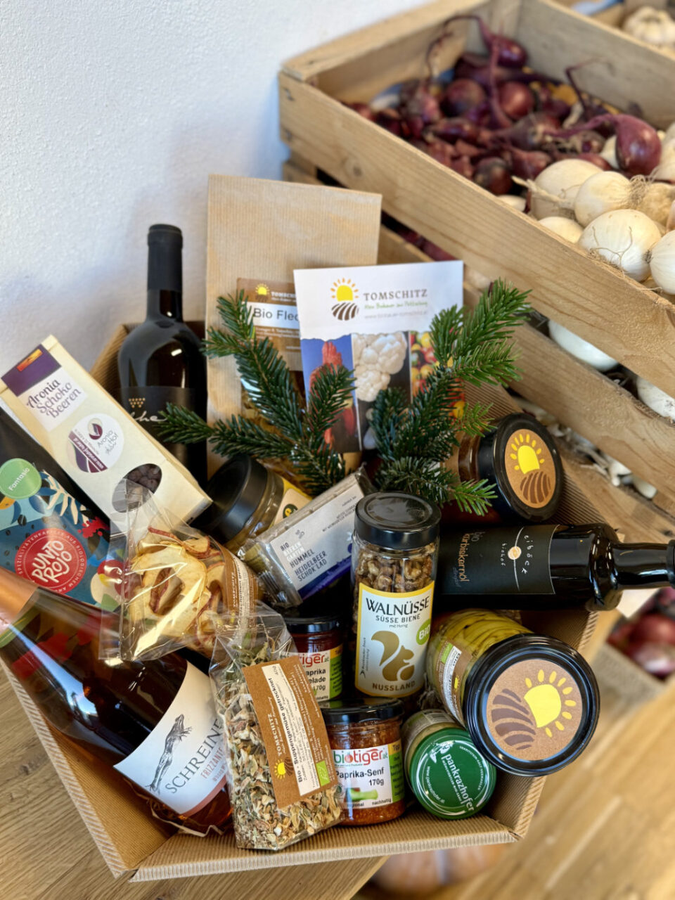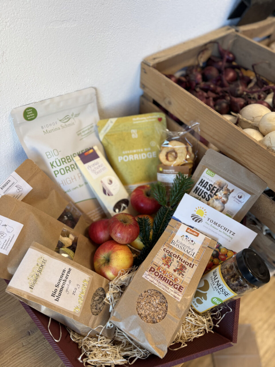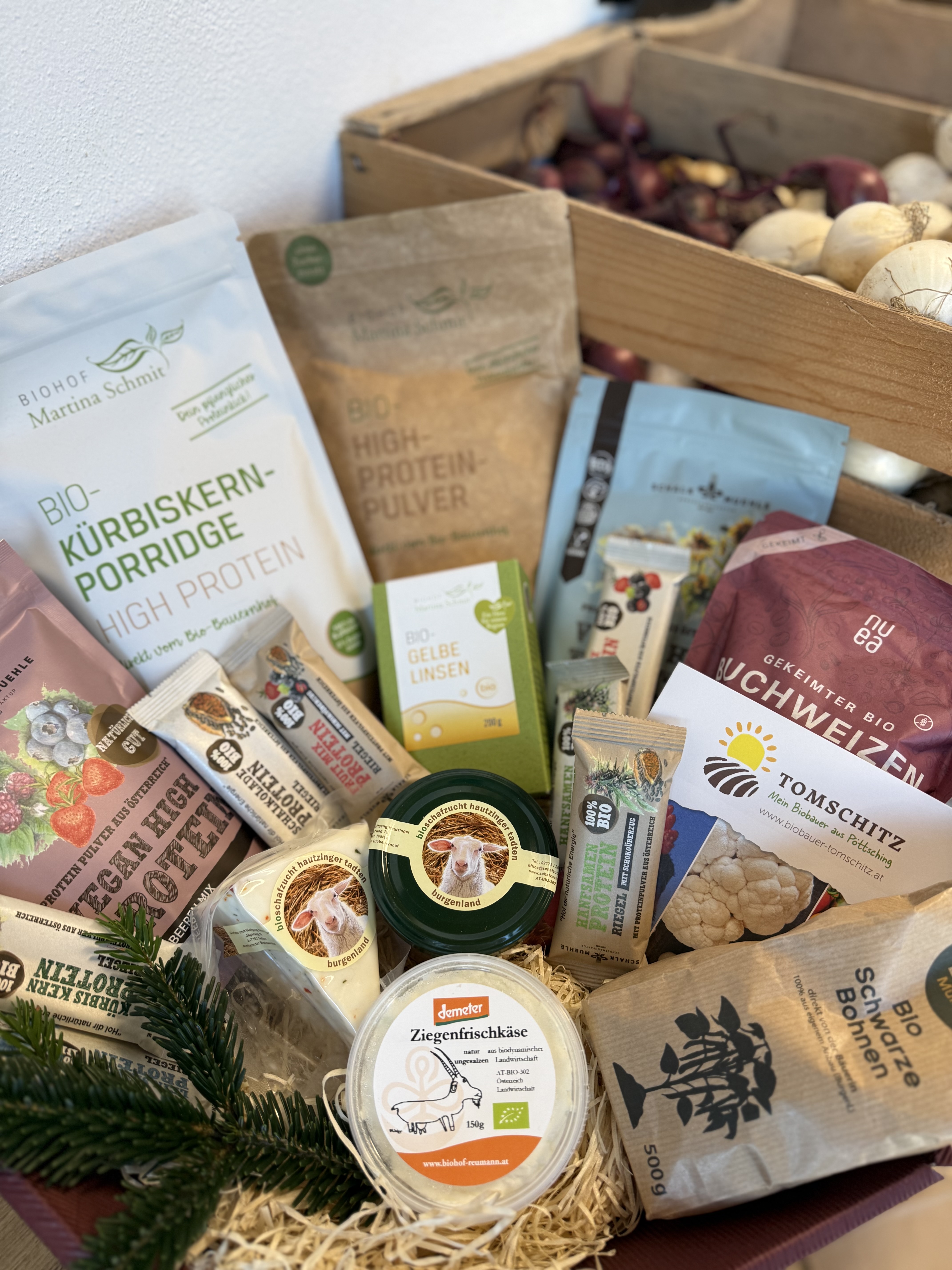Verschenken Sie Freude aus unserem Hofladen! Individuelle Geschenkkörbe – für jeden Anlass und jedes Budget – stellen wir gerne nach Ihren Wünschen zusammen. Besonders beliebt sind Themen-Körbe wie der Protein-Geschenkkorb, Müsli-Geschenkkorb oder der Pasta-Geschenkkorb. Wählen Sie aus unserem vielfältigen Bio-Sortiment und kreieren Sie ein persönliches Geschenk voller feiner Genussmomente! Ob klein und fein oder großzügig gefüllt – überraschen Sie Ihre Lieben mit regionalen Köstlichkeiten und besonderen Leckerbissen aus nachhaltigem Anbau.