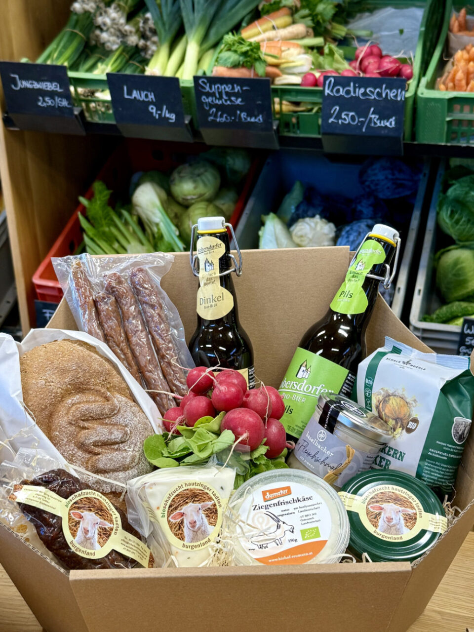 Unsere Bio-Backwaren und Spezialitäten vom Biohof Tomschitz füllen die Körbe ebenso wie die sorgfältig hergestellten Produkte von Biobäuerin Martina Schmitt.